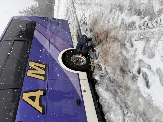 今年度入社した乗務員を中心に雪道での急制動、チェーン脱着方法を