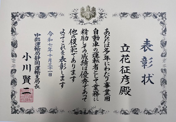いつもドリーム観光バスをご利用いただきありがとうございます。 先日、中部運輸局静岡運輸支局長表彰式が行われ弊社から 1名表彰を受けました。 運転業務歴23年以上で過去2年間無事故無違反(条件あり)の 運転者が対象となる表彰でした。 引き続き安全運転に努めてまいります。